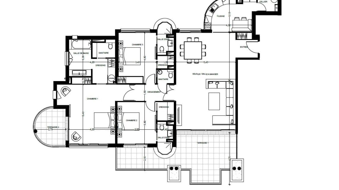L’appartement dispose d’un spacieux séjour ouvrant sur une belle terrasse, ainsi que d’une cuisine indépendante avec cellier. La suite parentale bénéficie de sa propre terrasse privée, d’un dressing, d’une salle de bains et de WC. Une deuxième chambre est équipée d’un dressing, d’une salle d’eau et de WC privatifs, tandis que la troisième chambre possède son propre dressing. Un WC et une salle de douche supplémentaires sont situés dans le couloir pour plus de confort.